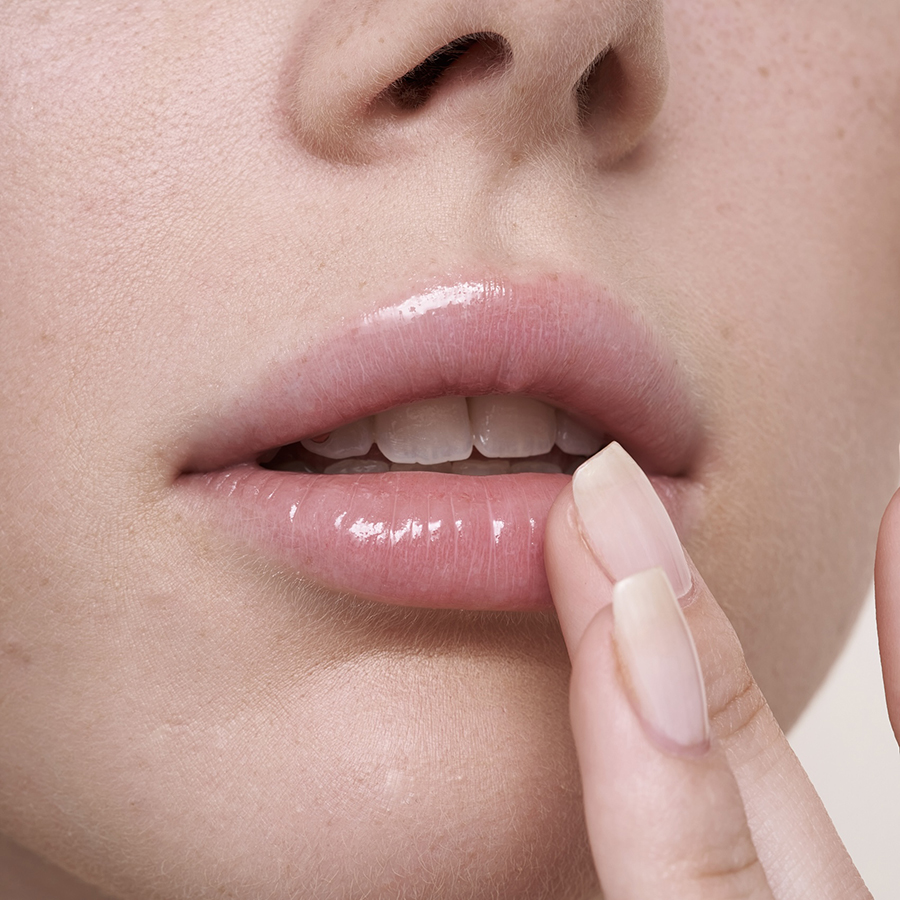 Равномерно нанести необходимое количество бальзама на губы с помощью пальцев или кисти.